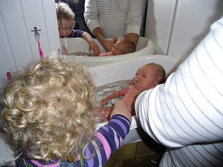 Arvids första bad hemma. Vi hjälpte till alla tre. Han tyckte om det och låg och mös i badet. Elsa tyckte det var roligt att hjäpa till att tvätta.